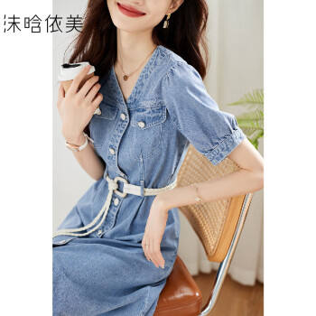 【气质收腰短袖牛仔连衣裙】夏季百搭薄款牛仔连衣裙牛仔蓝色L
