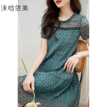 【植绒碎花裙子】夏季圆领短袖小荷叶边雪纺女连衣裙绿色M